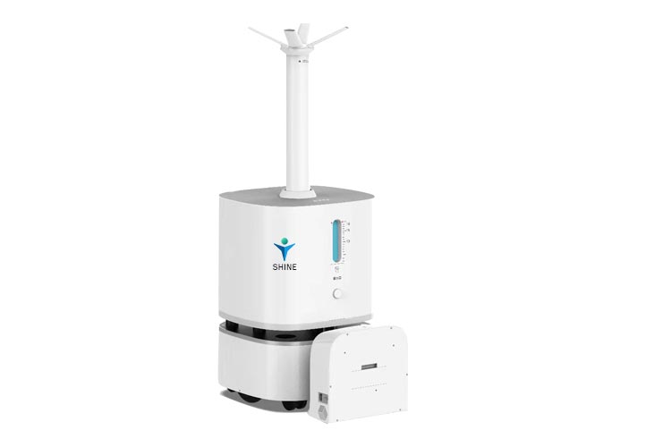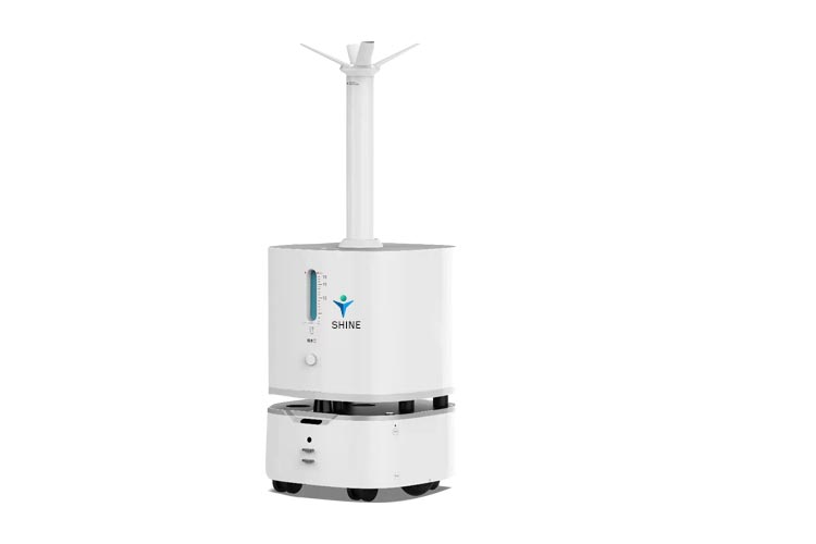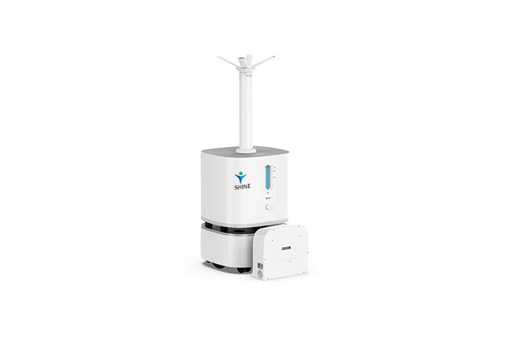 Shine befugtningsdesinfektion smart robot, 360 all-round desinfektion, god spredning, fuld dækning, for at opnå kortkonstruktion, nøjagtig positionering i realtid, autonom navigation, autonom ruteplanlægning, intelligent undgåelse af forhindringer, automatisk returbunkeopladning